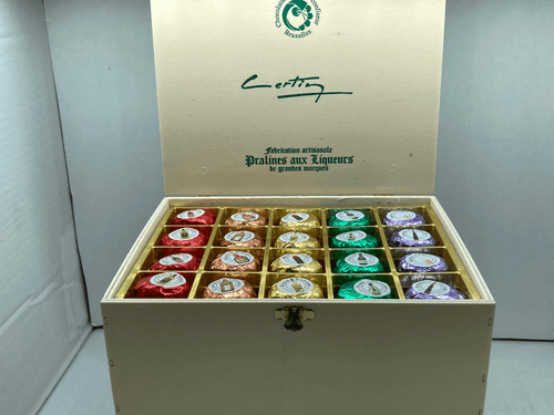 Assortiment de pralines aux dix liqueurs de grandes marques enrobées de chocolat noir 60 % de cacao